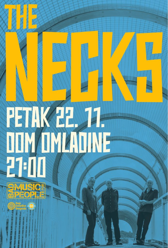 Kultni australijski bend The Necks, u sastavu Chris Abrahams (klavir), Tony Buck (bubnjevi) i Lloyd Swanton (kontrabas), sa preko 20 objavljenih albuma predstaviće se po treći put beogradskoj publici u petak, 22. novembra u Velikoj sali Doma omladine, u 21:00.